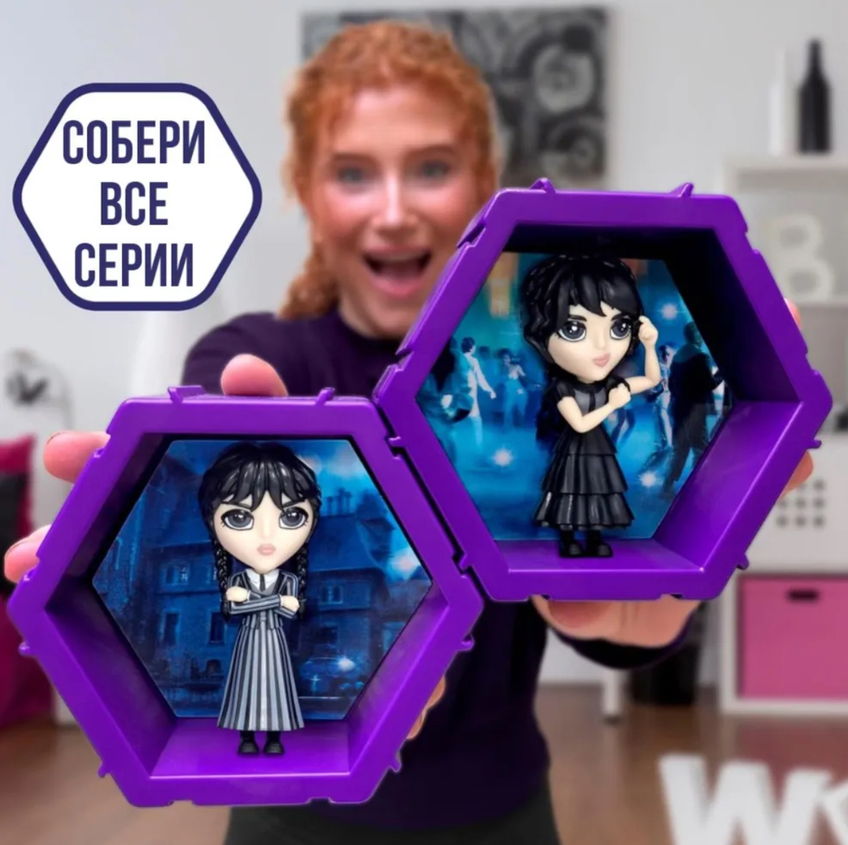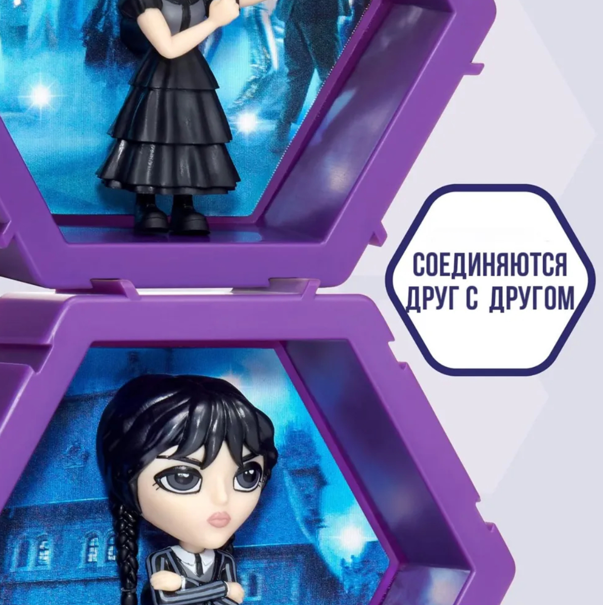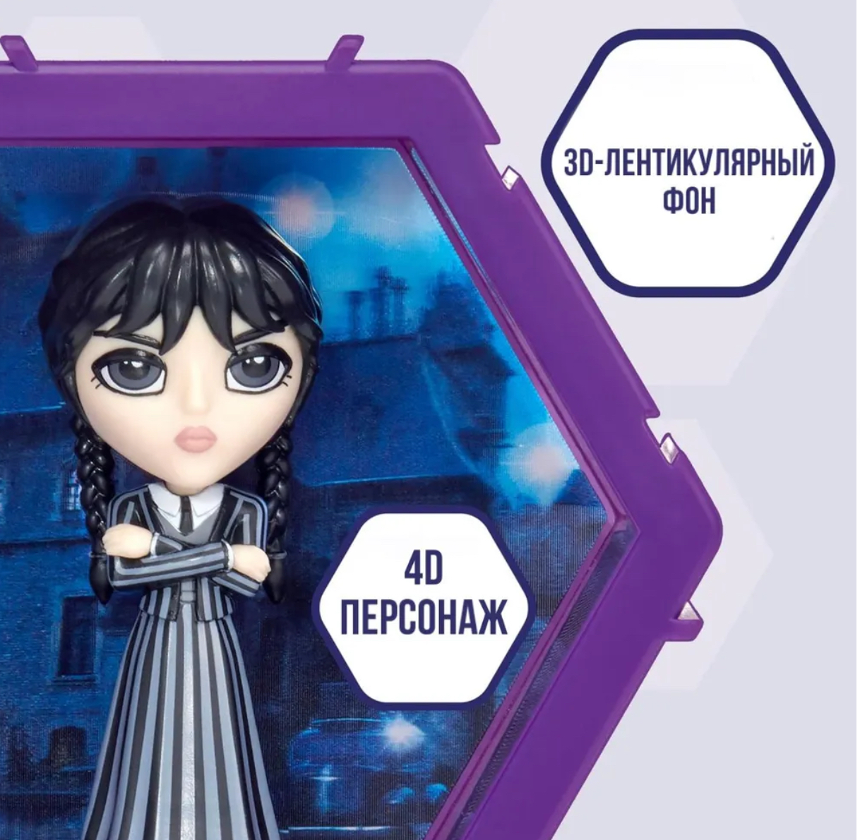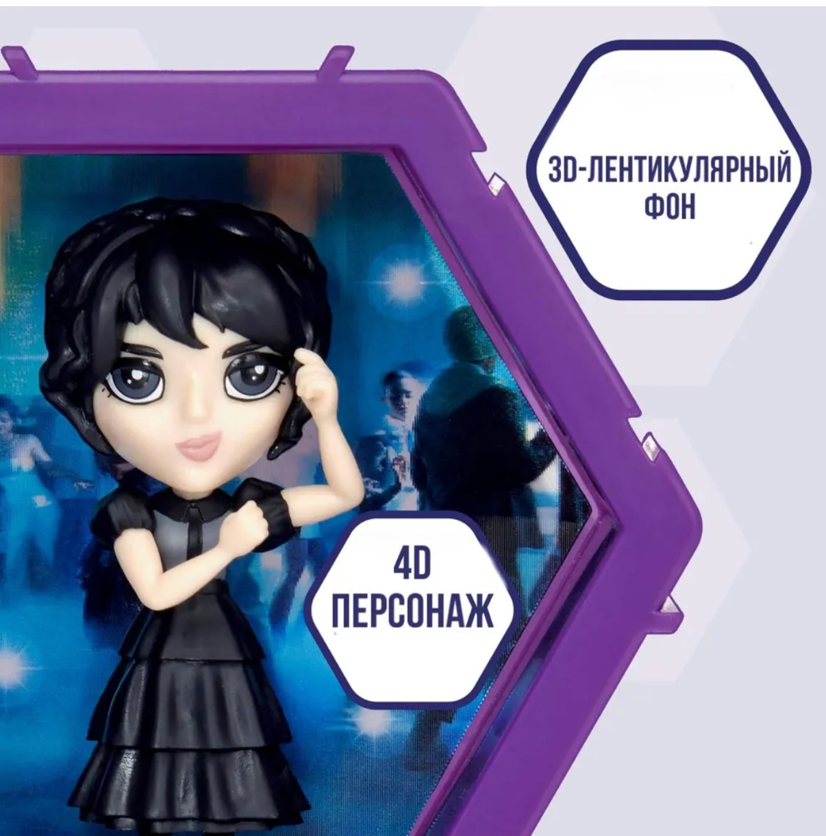 Коллекционная фигурка Pods 4D WednesdayAddams. Двояковыпуклые 3D-фоны высокого разрешения дарят волшебные и совершенно необычные впечатления любителям коллекционных предметов. Уэнсдей, кажется, вырывается из своего мира в ваш с потрясающим 4D-эффектом!Pods 4D соединяются друг с другом. Придумайте и создайте свою собственную уникальную комбинацию и разместите ее на любой стене, полке, столе или подоконнике.В коллекцию входит Уэнсдей в униформеNevermore или в бальном платье - каждое из них продается отдельно.Высота каждой фигурки 8 см. Микрокраска наносится на каждого персонажа при окончательной сборке, а затем монтируется перед 3D-лентикулярным задником высокого разрешения. Эффект 4D оживляет ваших персонажей.