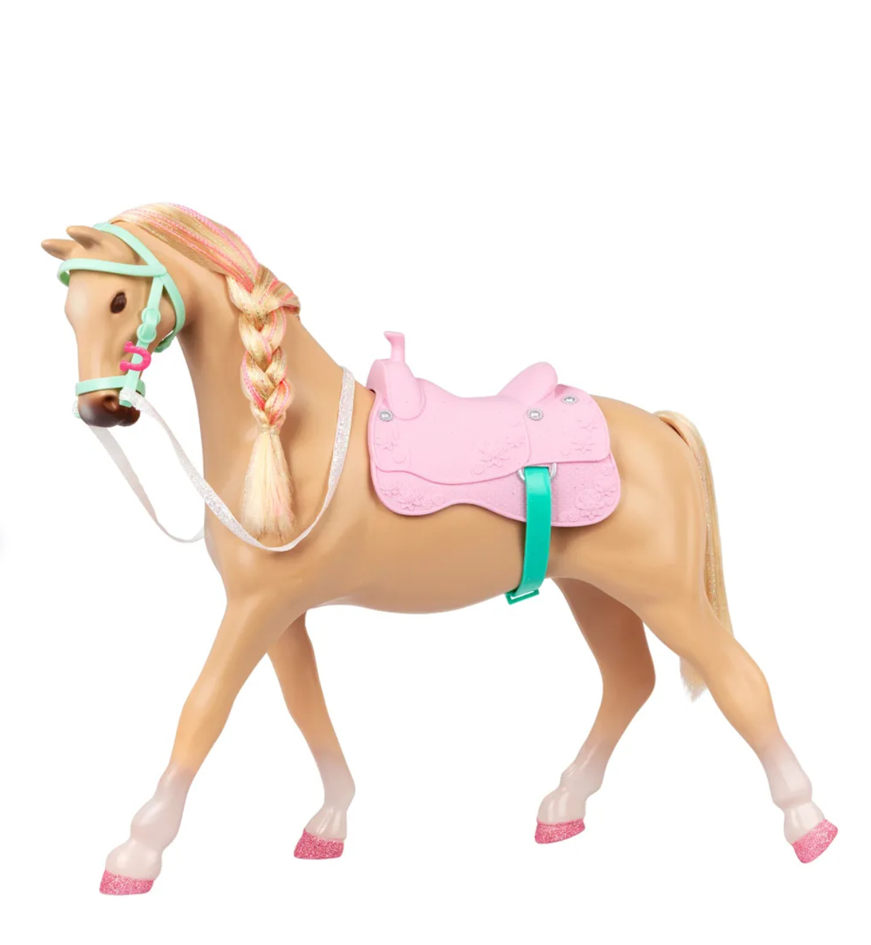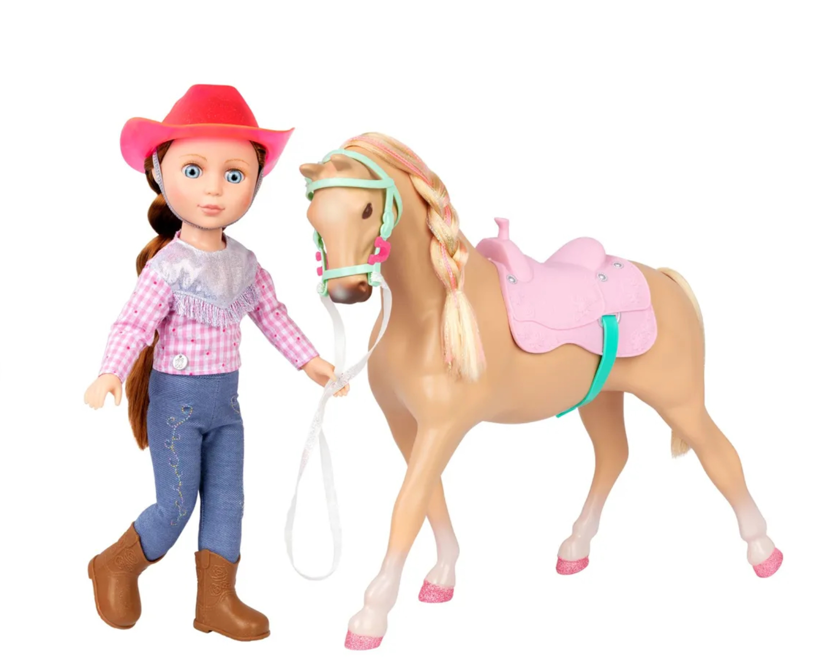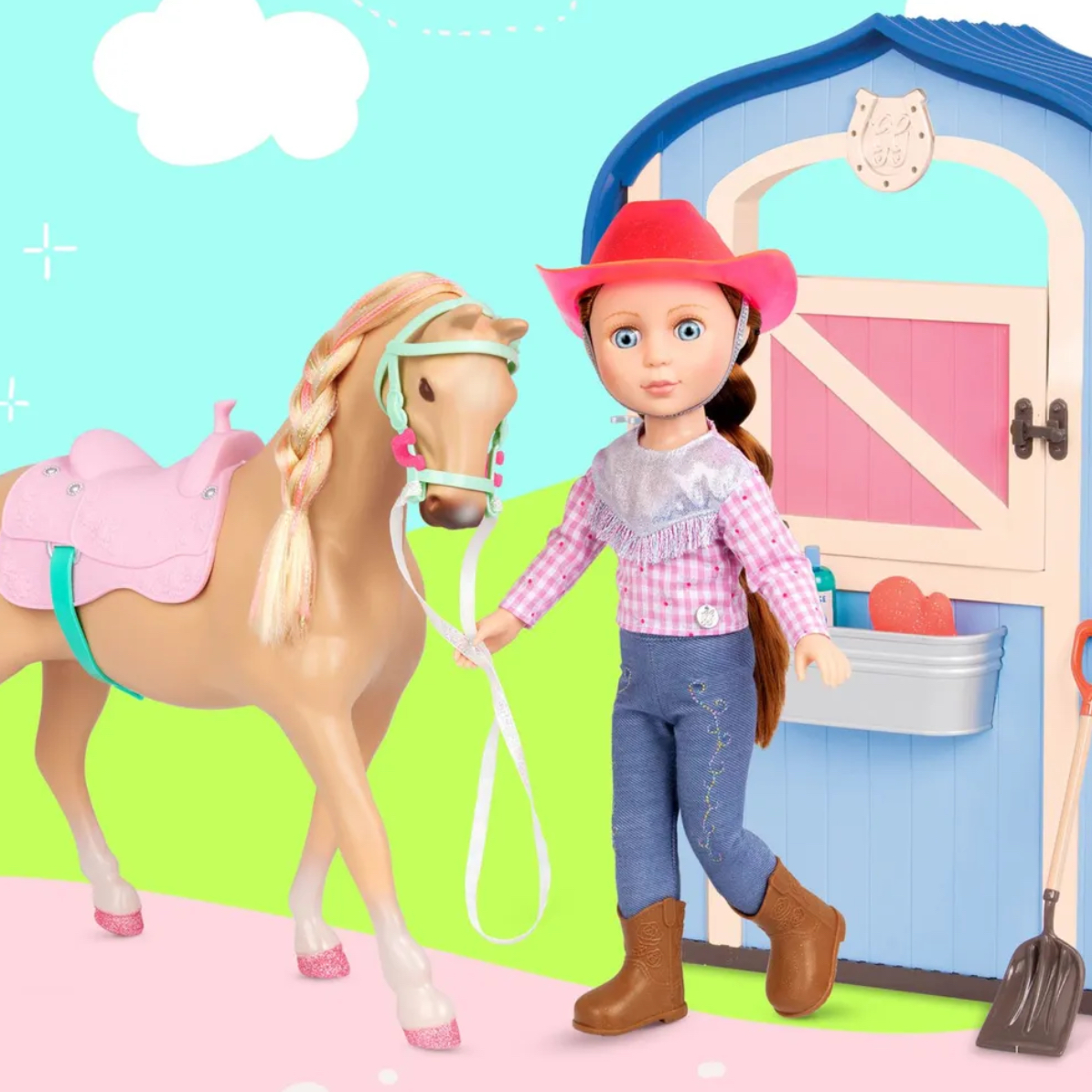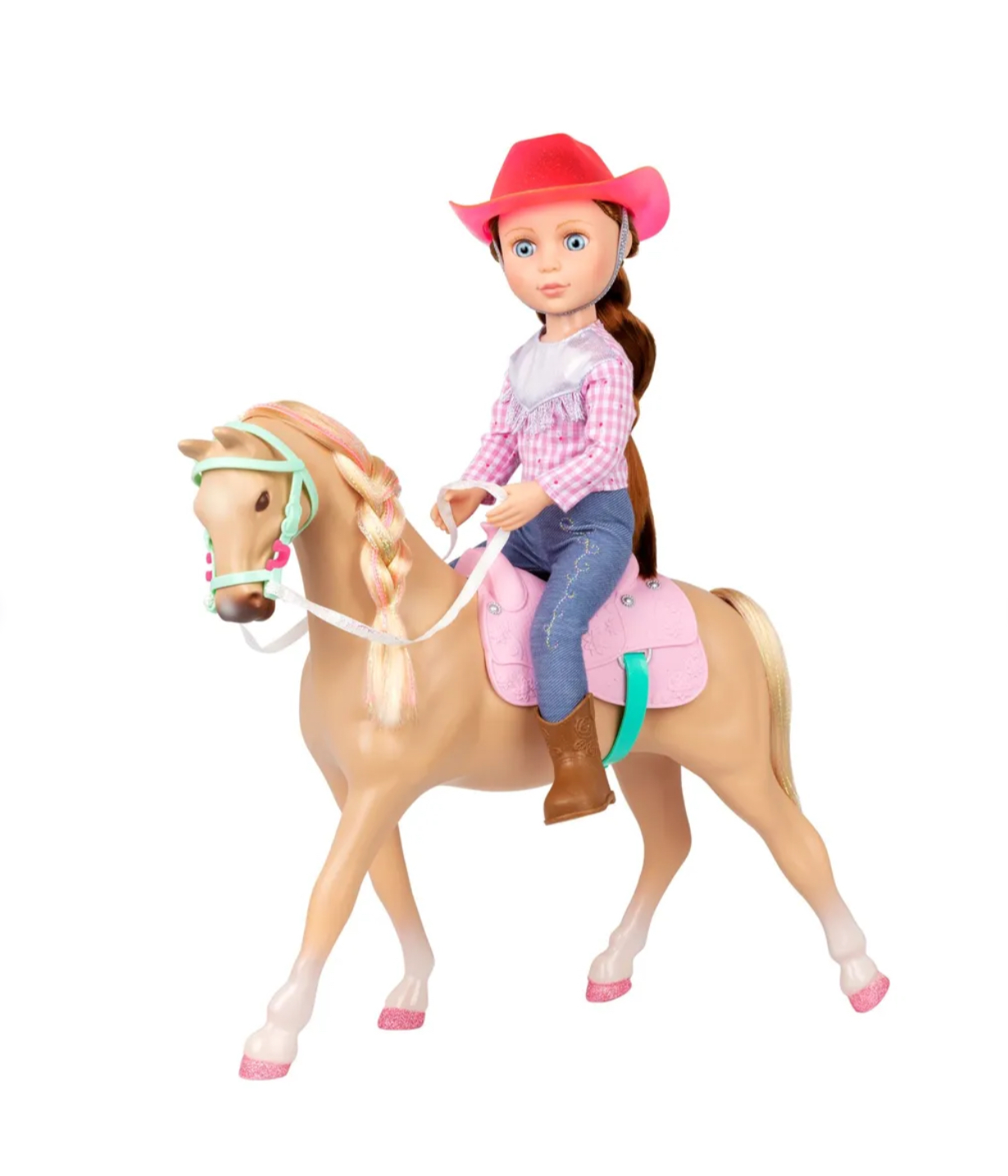 Отправляйтесь в ослепительные приключения с Jaime & Jumper, 14-дюймовой (35 см) куклой-наездницей и лошадью из сверкающего мира Glitter Girls! У Jaime яркие голубые глаза, длинные ресницы и длинные шелковистые каштановые волосы, которые весело расчесывать и укладывать. И она может позировать! Ее руки и ноги сгибаются и вращаются, чтобы легко сидеть на Jumper во время езды, и она может направлять своего друга-лошадь в любом направлении с помощью поводьев, чтобы вместе открывать блестящие тропы! У Jumper красивая рыжевато-коричневая шубка с блестящими розовыми копытами, съемное седло и мягкая светлая грива с розовой мишурой для волос, уложенной в милую косу!