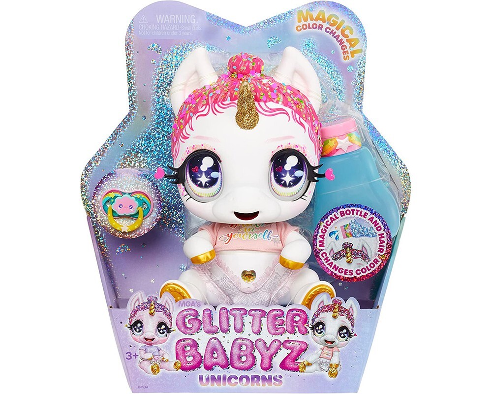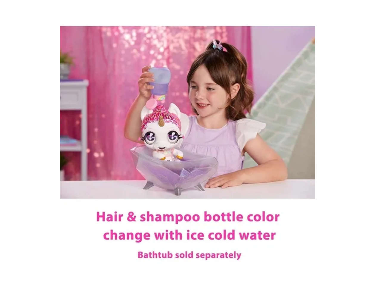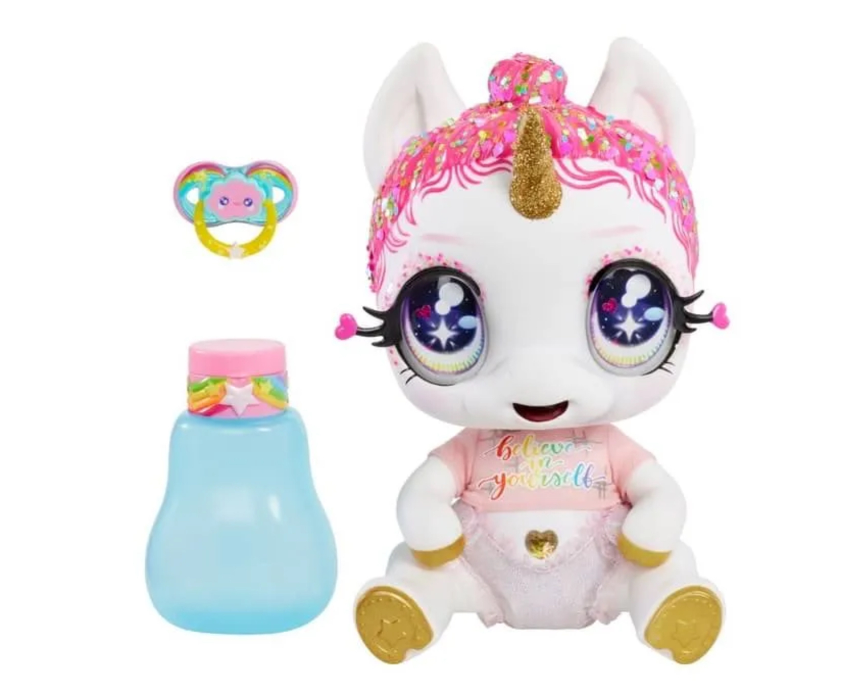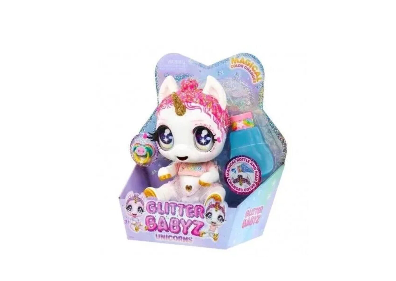 Glitter Babyz — это сверкающие волшебные малыши, у которых большие, красивые глаза, блёстки на ресницах и блёстки в волосах. У этих единорогов есть способность – волосы меняют цвет с помощью холодной воды и волшебного шампуня, пузырёк от которого также меняет цвет. Покажите своей единорожке всю нежную любящую заботу, чтобы сохранить её магию живой и искрящейся. Дайте ей соску, смените подгузник, искупайте (ванна продается отдельно), а затем уложите её вздремнуть.В комплект входит: • съёмная футболка, • блестящий многоразовый подгузник, • пустышка, • бутылочка волшебного шампуня, меняющего цвет, • блестящий единорог с волосами, меняющими цвет.