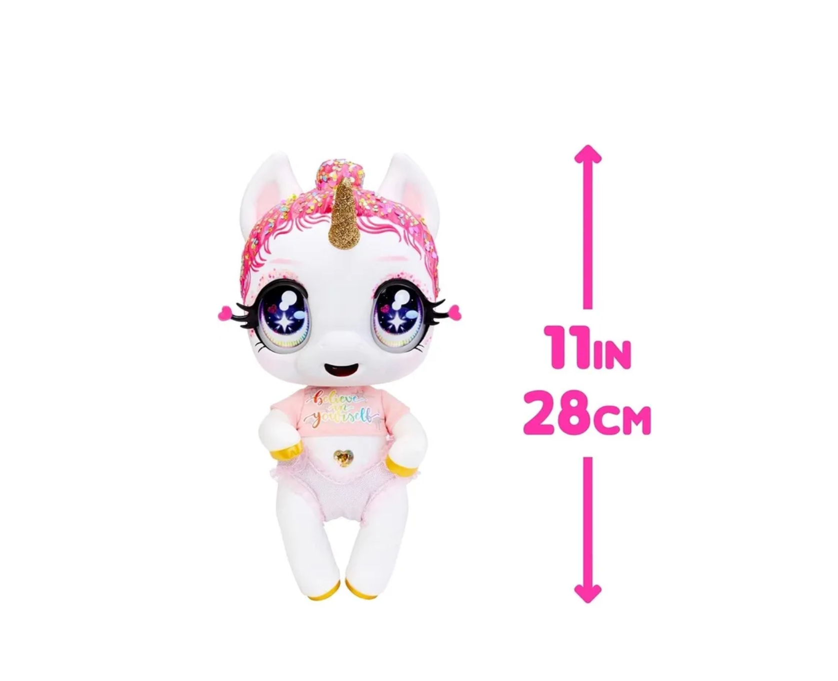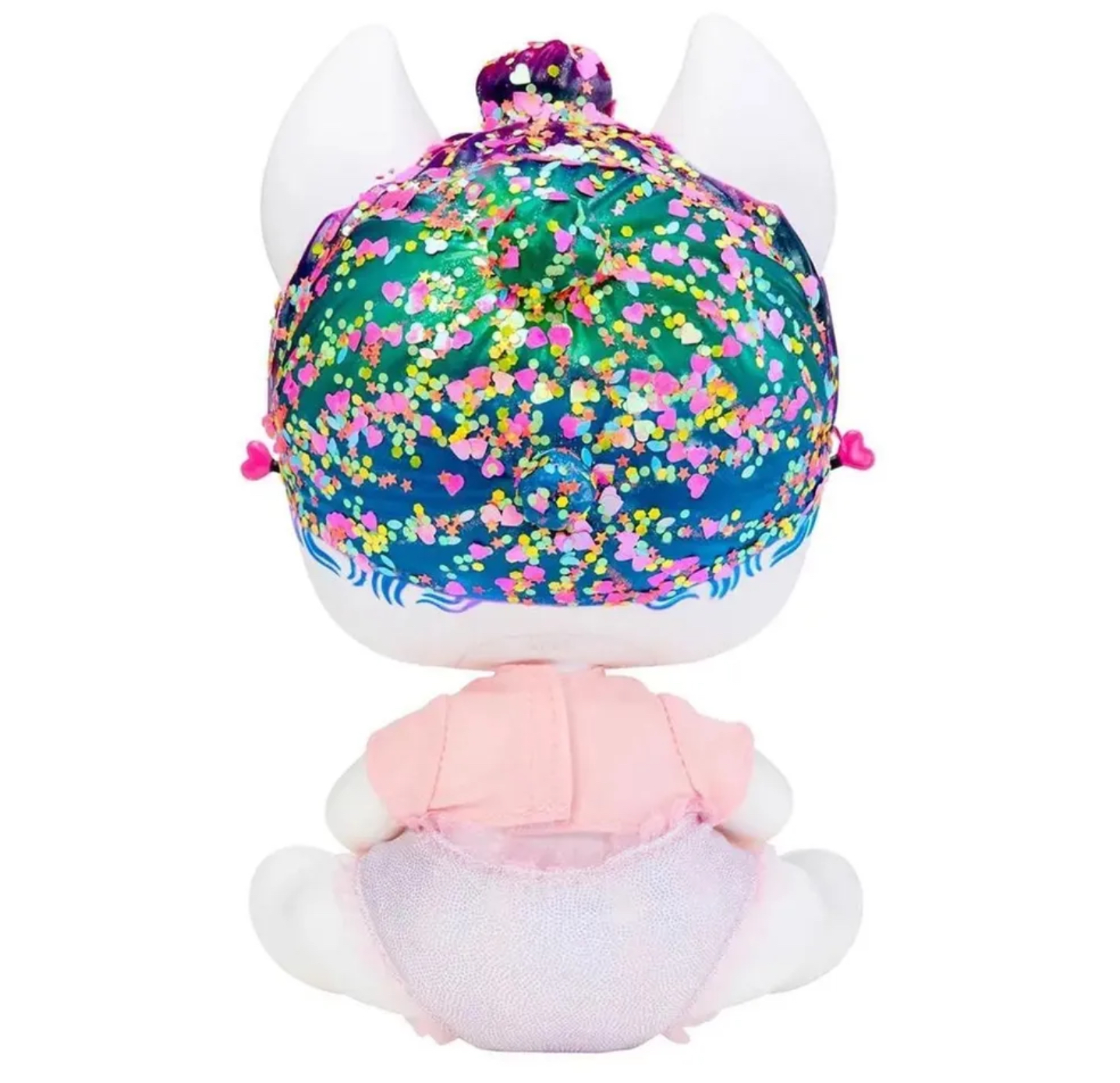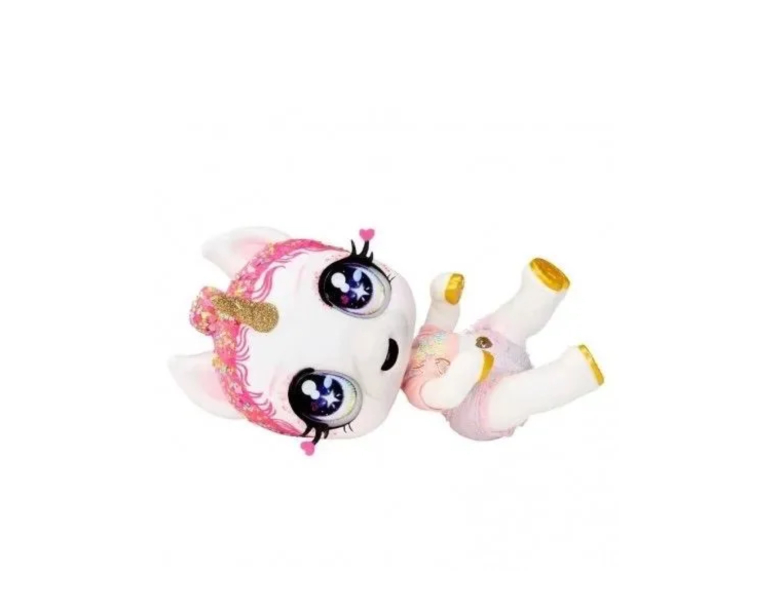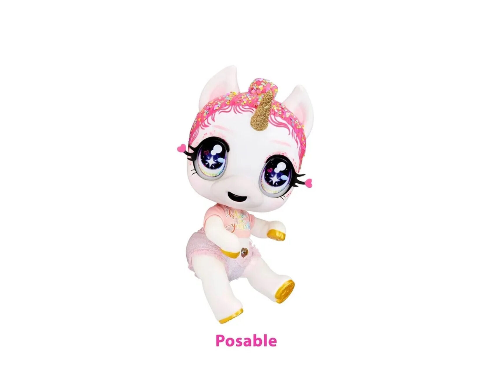 Glitter Babyz — это сверкающие волшебные малыши, у которых большие, красивые глаза, блёстки на ресницах и блёстки в волосах. У этих единорогов есть способность – волосы меняют цвет с помощью холодной воды и волшебного шампуня, пузырёк от которого также меняет цвет. Покажите своей единорожке всю нежную любящую заботу, чтобы сохранить её магию живой и искрящейся. Дайте ей соску, смените подгузник, искупайте (ванна продается отдельно), а затем уложите её вздремнуть.В комплект входит: • съёмная футболка, • блестящий многоразовый подгузник, • пустышка, • бутылочка волшебного шампуня, меняющего цвет, • блестящий единорог с волосами, меняющими цвет.