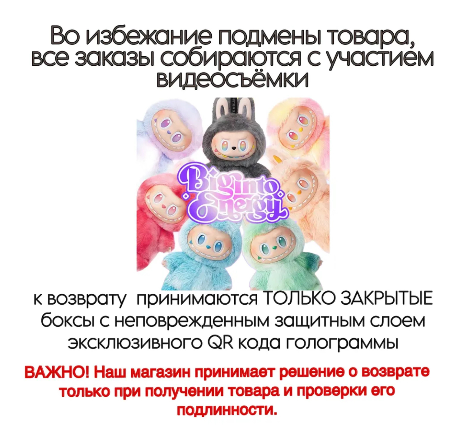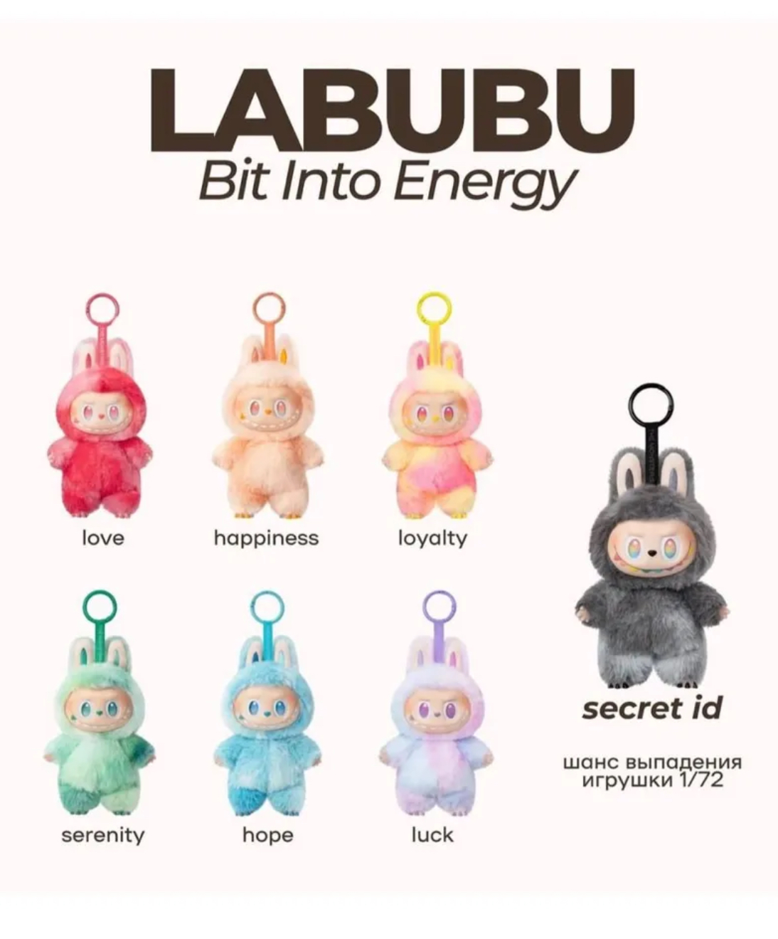 Labubu — это не просто игрушки, это истинное воплощение моды и креативности. Они станут отличным дополнением для коллекции, подарком для друзей или ярким декором вашего пространства • LOVE (Любовь) — красный• HAPPINESS (Счастье) — оранжевый• LOYALTY (Преданность) — розово-жёлтый• SERENITY (Спокойствие) — зелёный• HOPE (Надежда) — синий• LUCK (Удача) — фиолетовый• СекретныйДля самых удачливых коллекционеров предусмотрено секретное издание: фигурка с чёрным мехом, радужными блестящими глазами и зубами. Шанс найти её составляет 1 к 72, что делает её настоящей жемчужиной коллекции.