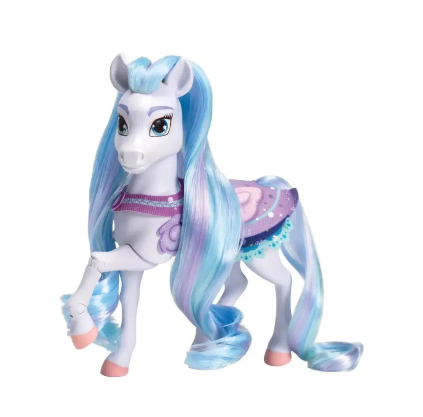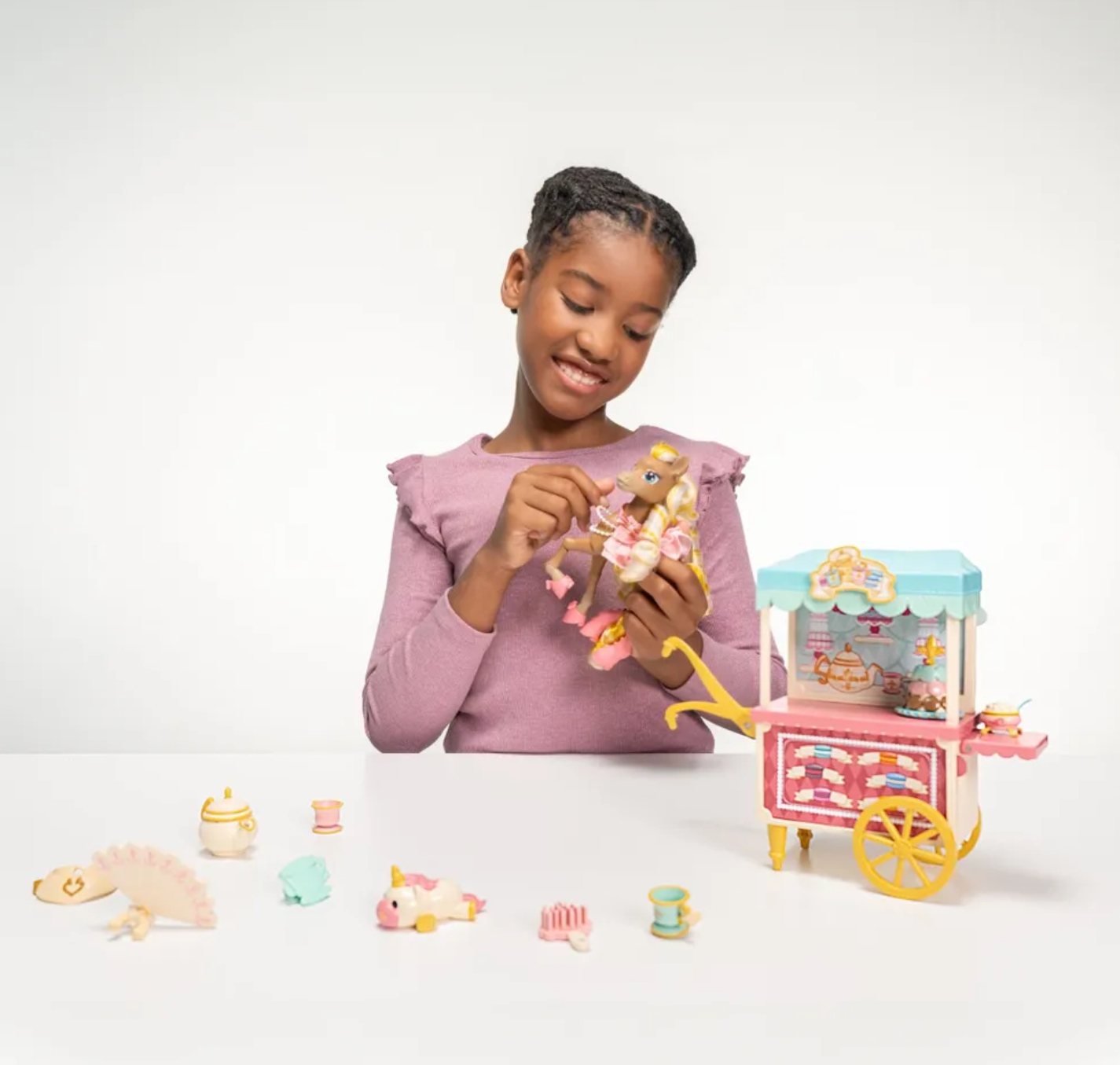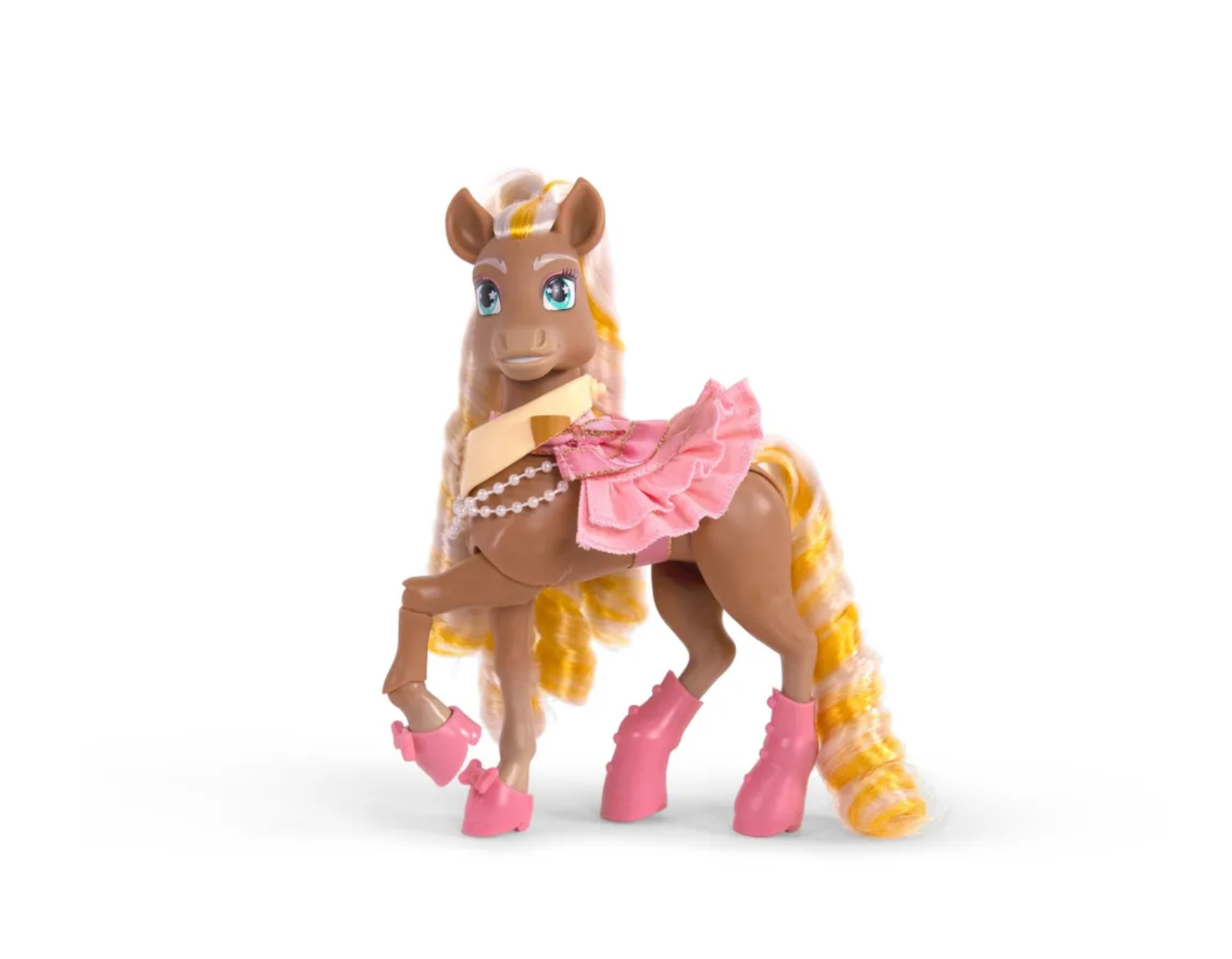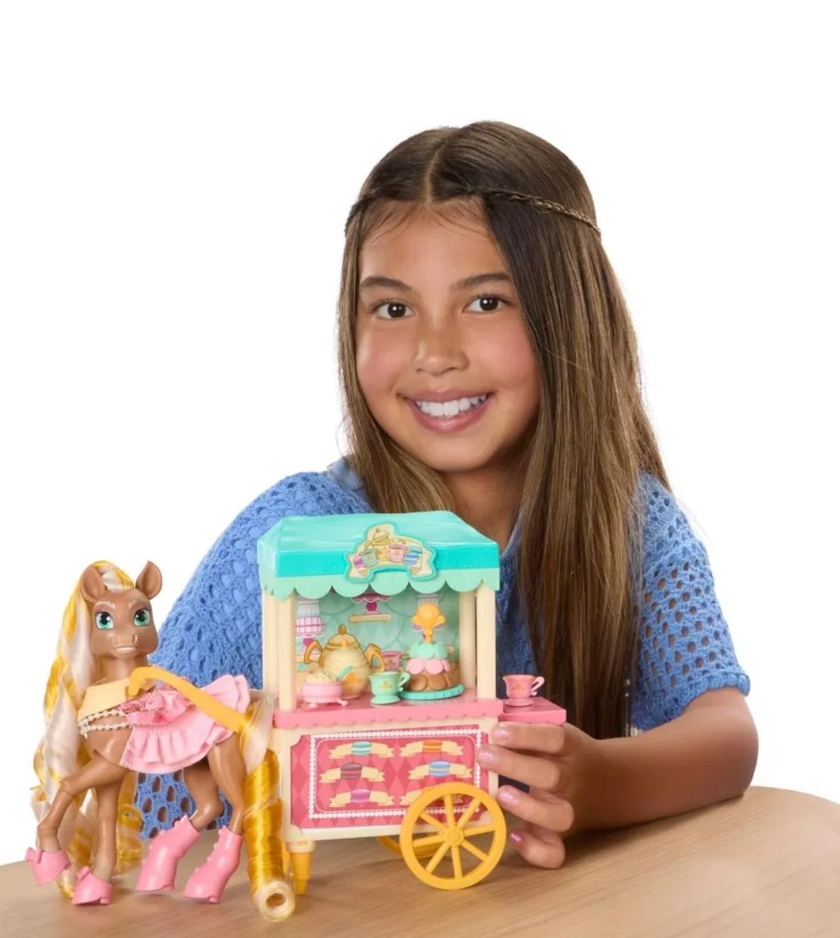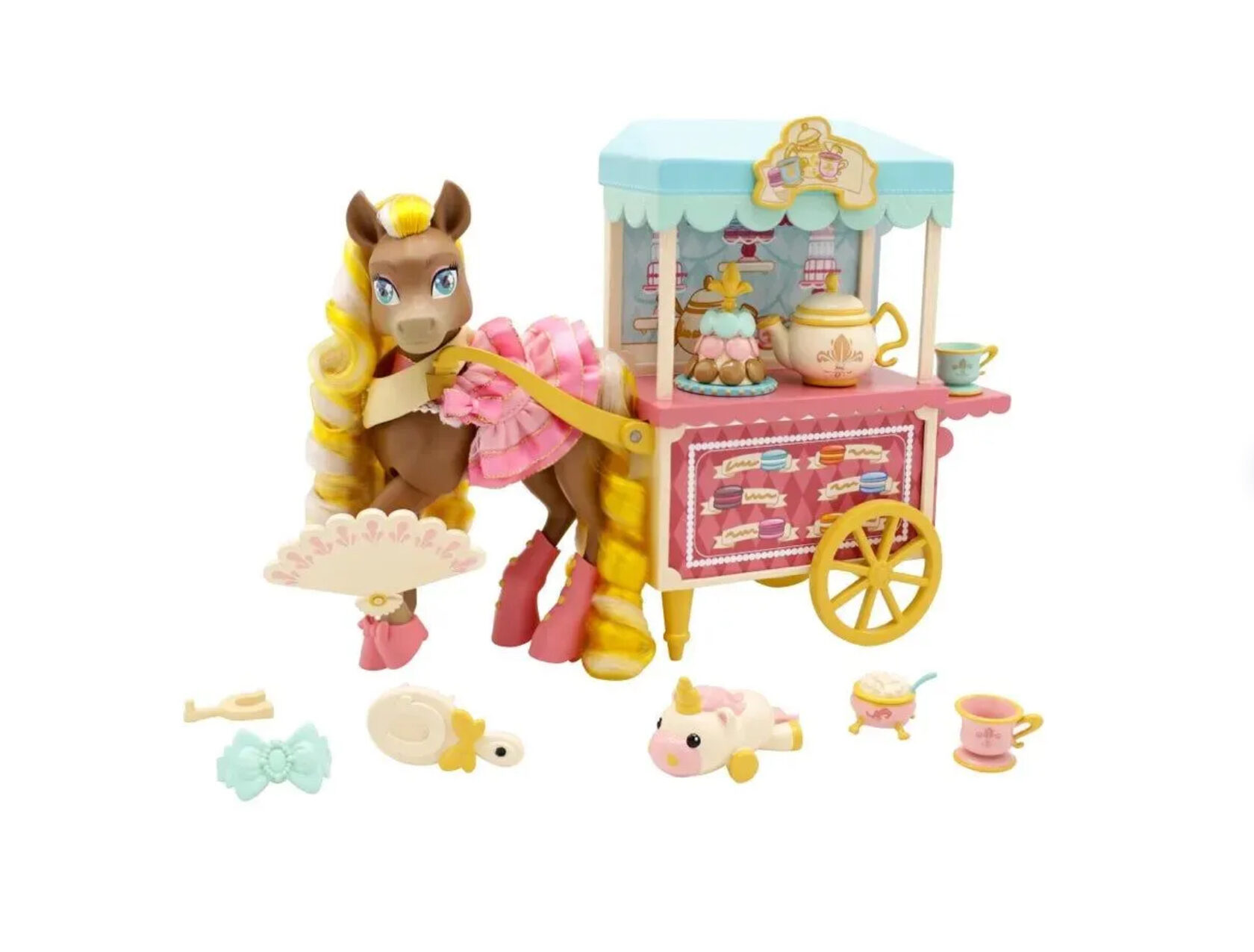 Золотая полоса в волосах Шери символизирует ее невероятную щедрость — она любит баловать своих друзей весельем, нарядами и парижским гламуром!У Шери подвижные передние конечности, чтобы позировать в нарядах от кутюр.Тележка на колесах для чая и сладостей крепится к Шери с помощью упряжи и оснащена аксессуарами для макарон и чайного сервиза.Шери может удерживать свой украшенный вычурными оборками веер и другие модные аксессуары с помощью фирменных зажимов в форме подковы.В комплект с Чери также входят расческа для укладки и мягкая игрушка в классической золотисто-белой цветовой гамме!