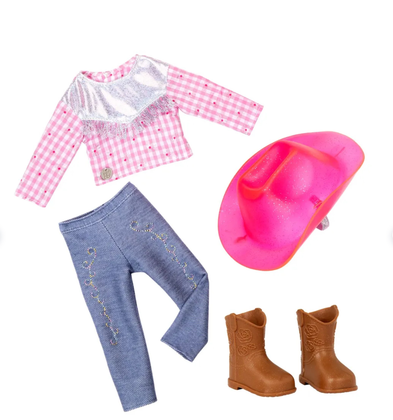 Каждая из кукол Glitter Girls поставляется с одним нарядом. Jaime одета в милый клетчатый топ с забавной серебряной бахромой, пару джинсовых брюк, высокие коричневые сапоги и блестящую ковбойскую шляпу — для дополнительного блеска! Ее наряд также имеет легко открывающиеся застежки, чтобы быстро надевать и снимать, так что Джейми может отправиться в любое приключение во множестве красочных образов!