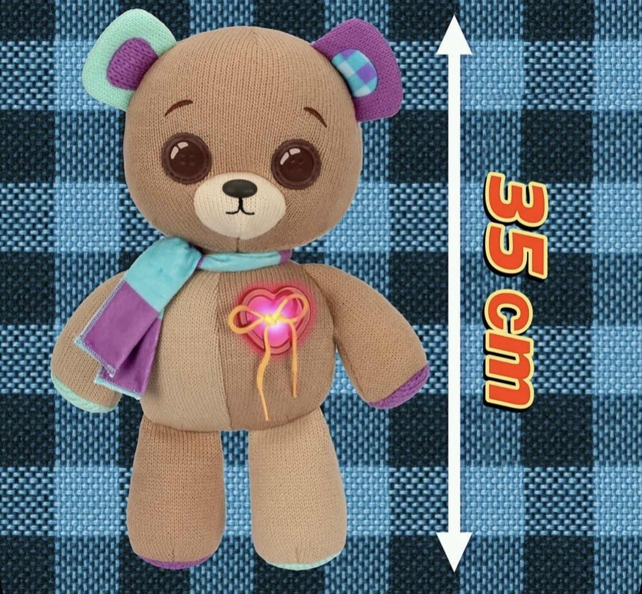 Мишка высотой 35 сантиметров, он идеально подходит для детей в возрасте от 3 лет и старше и станет прекрасным приятным компаньоном во всех приключениях!