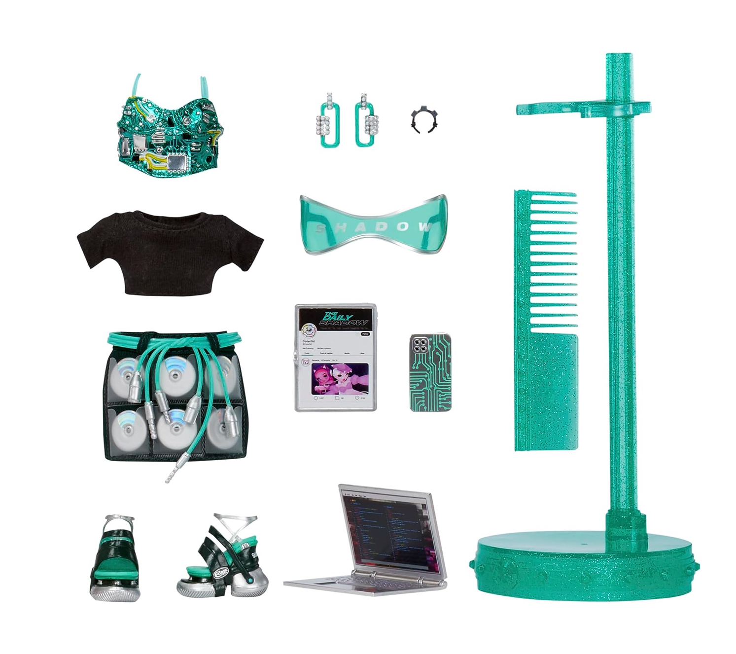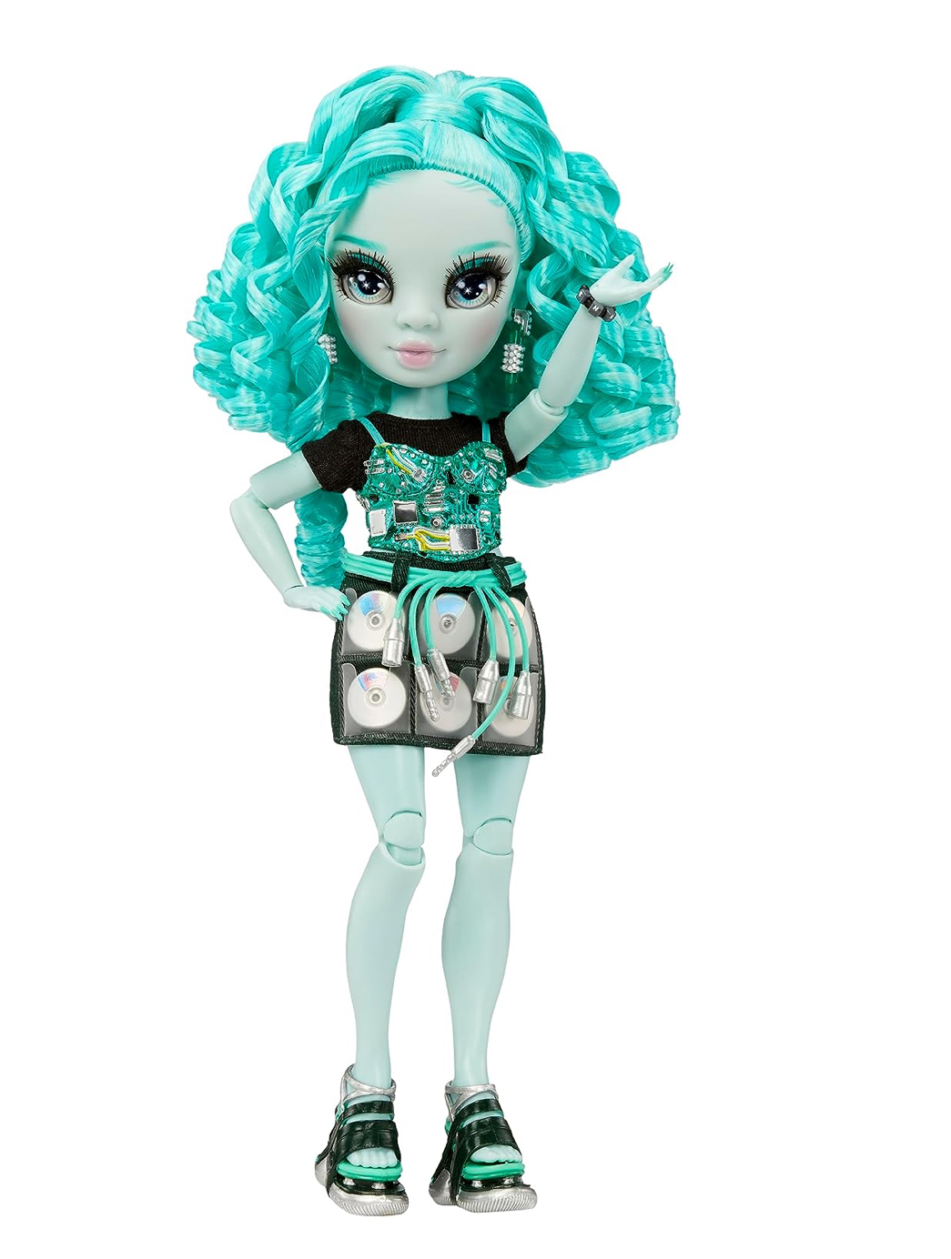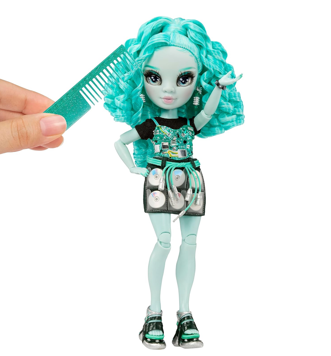Радуга предназначена для всех. Куклы Rainbow High Shadow High входят в красочную коллекцию, представляющию классические цвета радуги, но с уникальными приглушенными тонами кожи Shadow High. Берри среднего телосложения со светло-зеленой кожей. У нее вьющиеся сине-зеленые волосы. У нее также серовато-бирюзовые глаза, выцветшие сине-зеленые и белые брови и нежно-розовая и нежно-сине-зеленая помада.Берри носит простую черную футболку с переливающейся сине-зеленой геометрической рубашкой поверх. Она также носит юбку, которая напоминает футляр для DVD, поскольку в ее юбке много сине-зеленых DVD-дисков внутри пластикового клапана. Что касается ее обуви, то она носит черные, сине-зеленые и белые туфли на круглой подошве. Она дополняет аксессуарами серьги-кубики с жемчугом и черный браслет на правой руке, а ее ногти выкрашены в сине-зеленый цвет. В комплект входит модная кукла, 1 комплект одежды для куклы, 1 пара туфель на каблуках, 1 пара сережек, 1 браслет, 1 пара солнцезащитных очков, 1 сотовый телефон, 1 планшет, 1 компьютер, 1 расческа, подставка для куклы.Игрушка имеет шарнирное строение, что позволяет придавать множество разнообразных поз фигурке. Высота куклы 28 см. Совет: перед игрой тщательно вымойте волосы кукле, что бы смыть гель для укладки. Высушите волосы до суха и расчешите. Соберите все 6 модных кукол Shadow: Пинки Джеймс – розовая, Скарлет Роуз – темно-бордовая, Рози Редвуд – красная, Берри Скайс – Зеленая, Оливер Оушен – голубая, Лаванда Линн – фиолетовая. Куклы продаются отдельно.