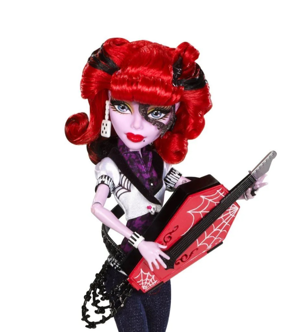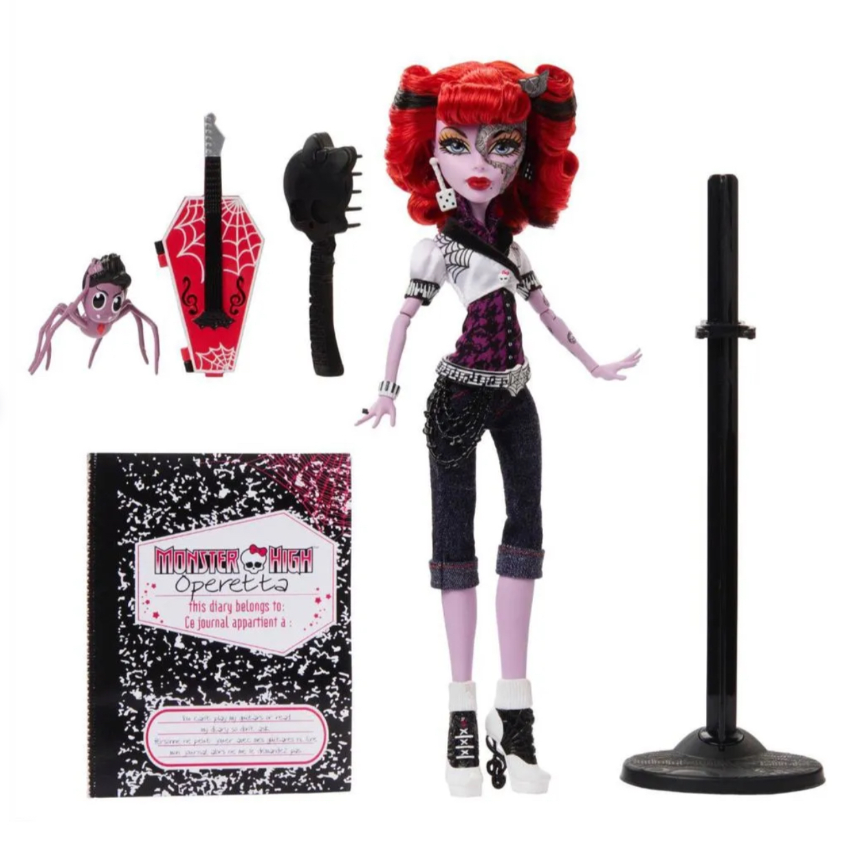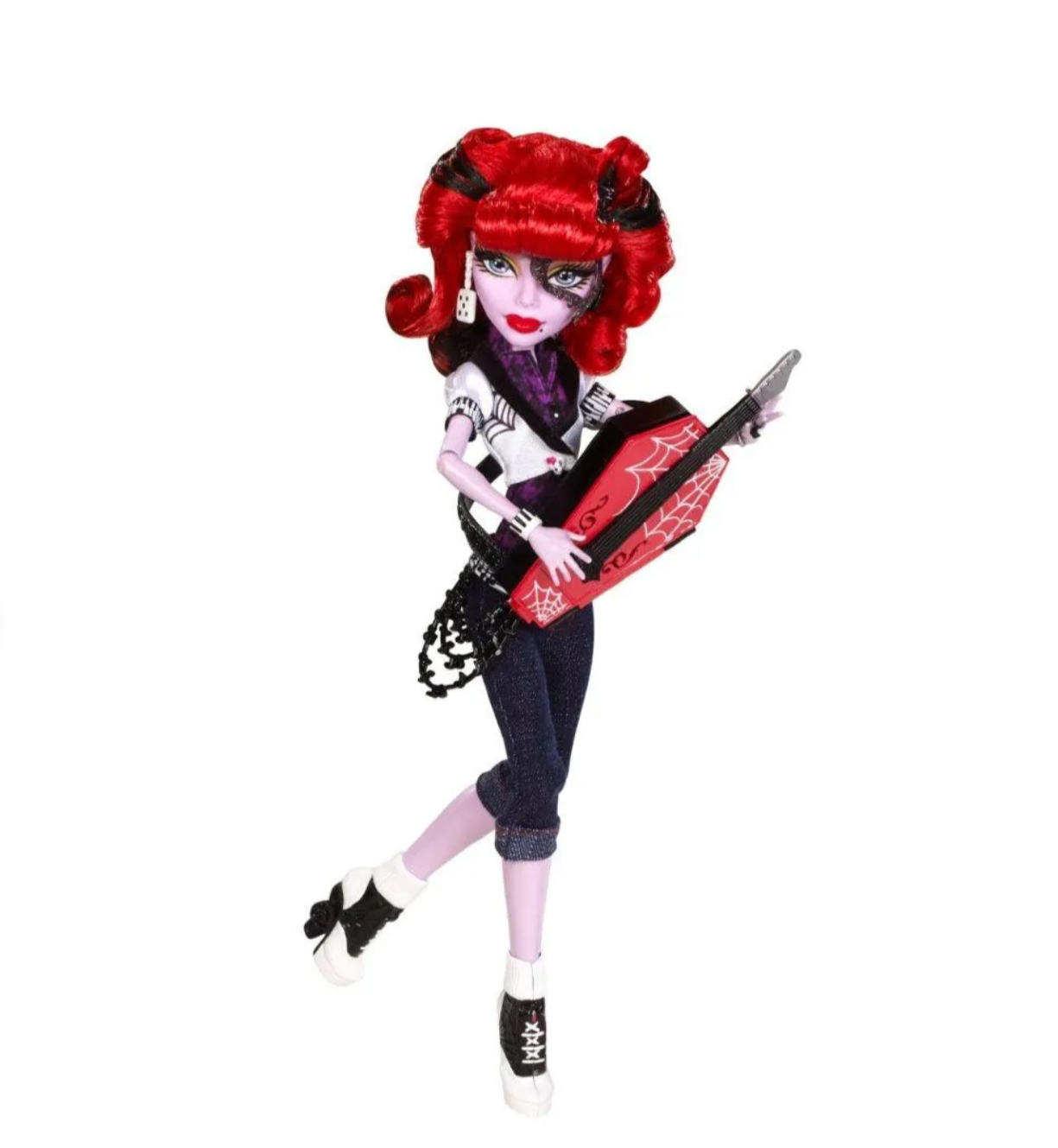 В своем оригинальном наряде, состоящем из блузки с воротником-стойкой, жакета с пышными рукавами и джинсов-капри, Оперетта воплощает настоящую фантазийную модуЗавитая челка обрамляет ее фирменный монокль в форме сердца и серьги-кубики, а драпированный пояс с нотами и каблуки со скрипичным ключом создают мелодичные акцентыУ нее также есть жутковатый стиль и предметы для рассказывания историй: гитара, затянутая паутиной, дневник, щетка и, конечно же, ее любимый питомец Мемфис “Папочка О” ДлинноногийКуклу "Оперетта" можно держать на локтях, запястьях и коленях - поставьте ее на подставку для кукол, которая входит в комплект поставки, чтобы она могла играть и демонстрироваться на всеобщее обозрениеПоклонники могут собрать больше оригинальных гулей из школы Монстер Хай для встречи выпускников, каждая из которых продается отдельно, в зависимости от наличия