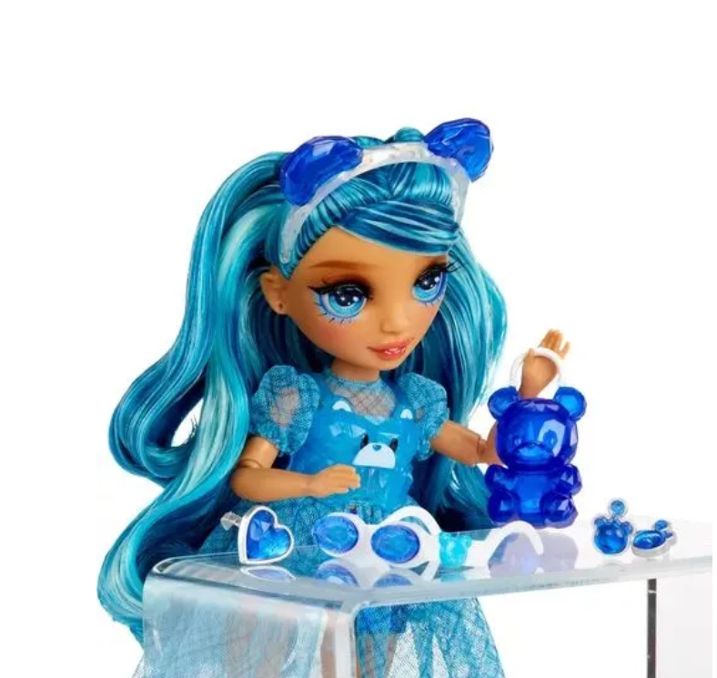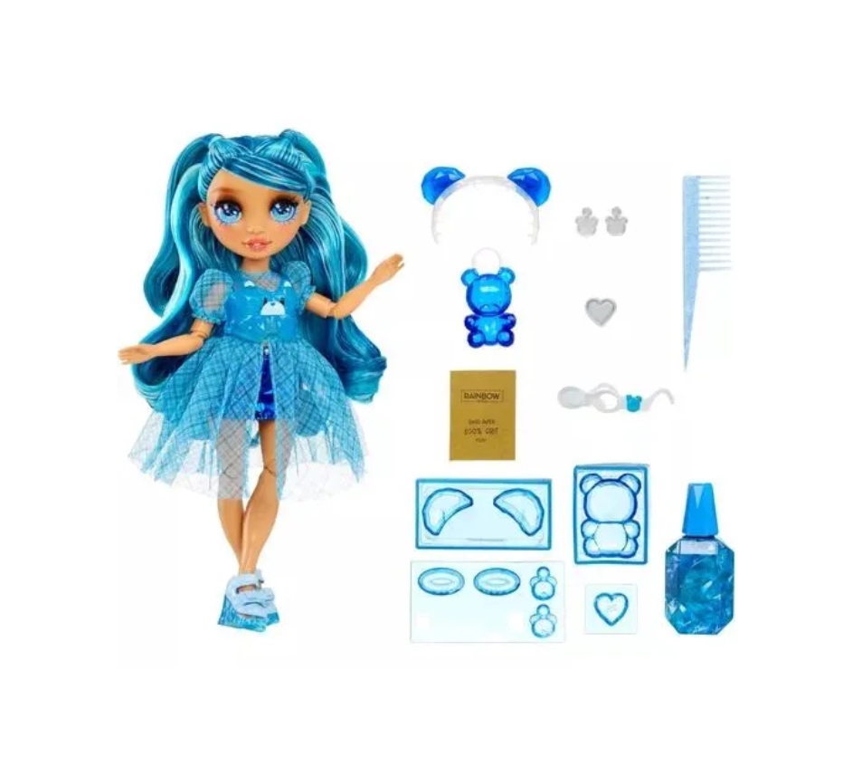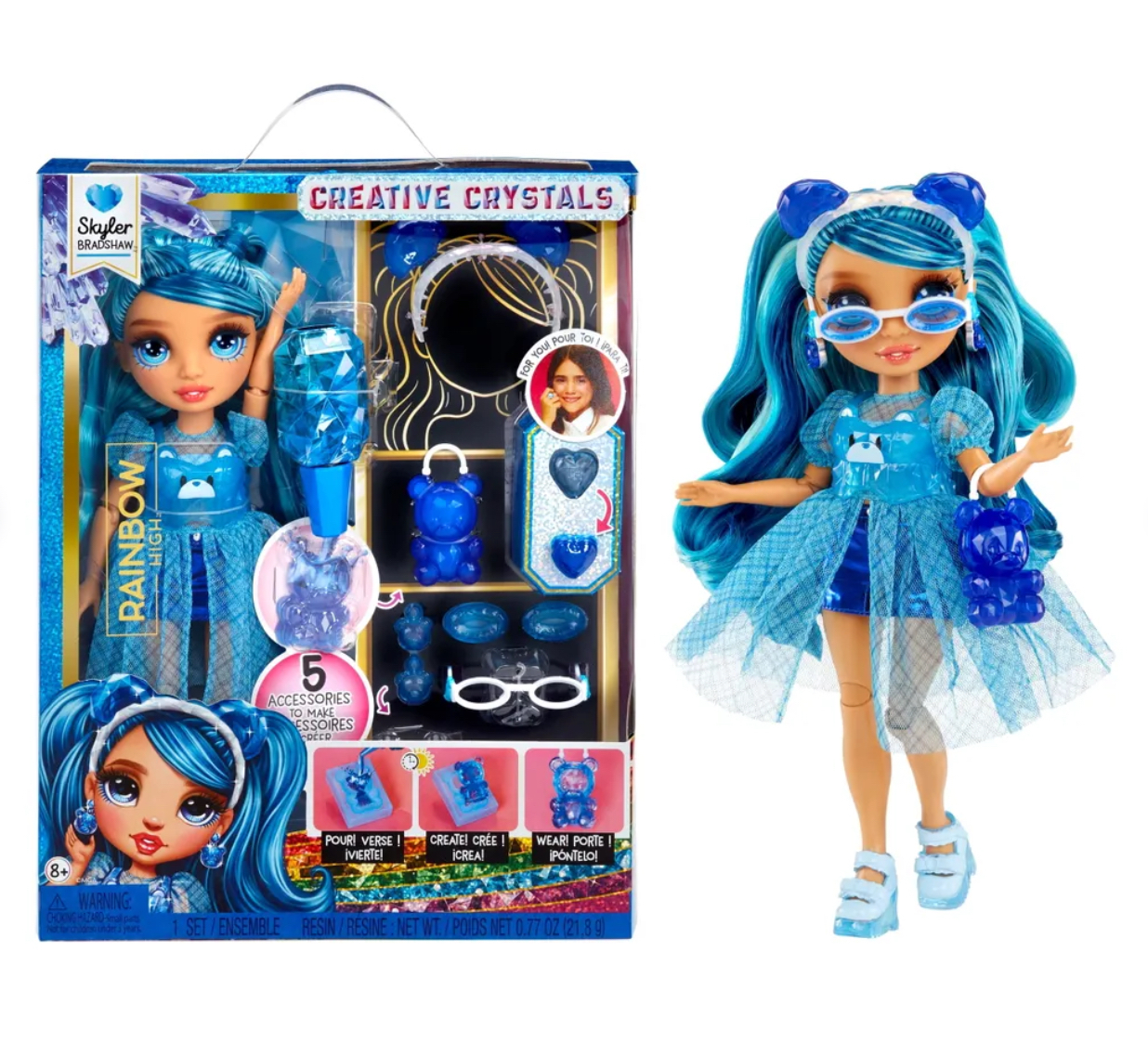 Процесс: Просто налейте смолу в форму. Оставьте на несколько минут на солнечном свете. Достаньте кристалл из формы. Защелкните кристалл на детали аксессуара. Играйте с куклой и всеми красивыми кристальными аксессуарами. Для правильного использования обязательно следуйте инструкции, которая прилагается к кукле. Вы и ваша кукла можете быть в одном стиле! Надевайте созданное вами кристальное кольцо одновременно с тем, как ваша кукла носит созданные вами для неё аксессуары. Скайлер одета в её фирменный голубой цвет с головы до пят с множеством блестящих деталей. У неё потрясающие, детализированные черты, красивые длинные голубые волосы, длинные ресницы и стеклянные глаза. Благодаря шарнирной конструкции, её легко настроить под себя и весело играть. Руки и ноги сгибаются, что позволяет создавать множество интересных поз, включая шпагат В комплекте : • Модная кукла, • набор для создания кристаллов (смола + формы + 5 деталей для аксессуаров: сумочка, серьги, солнцезащитные очки, ободок и кольцо для вас). Также в комплекте есть наждачная бумага и расческа.