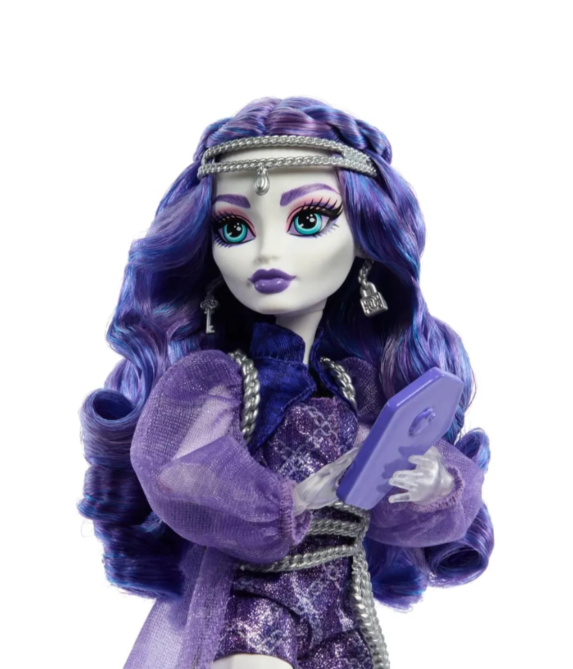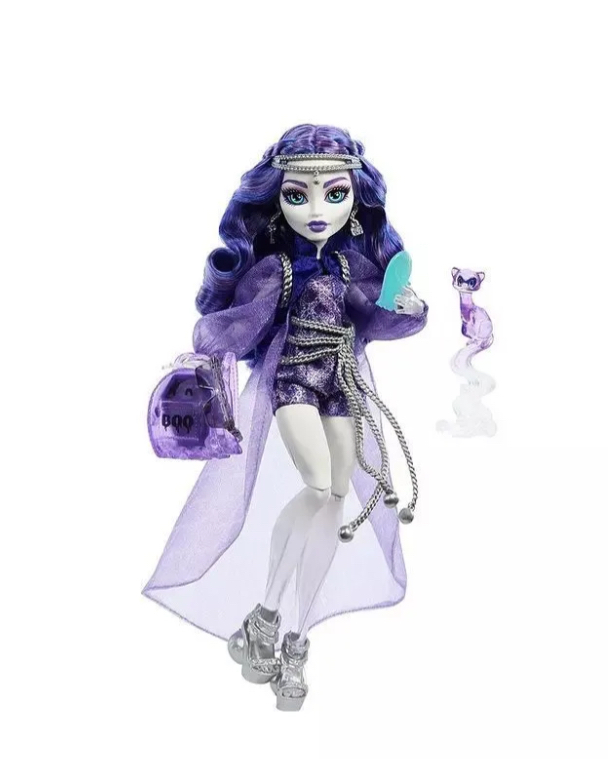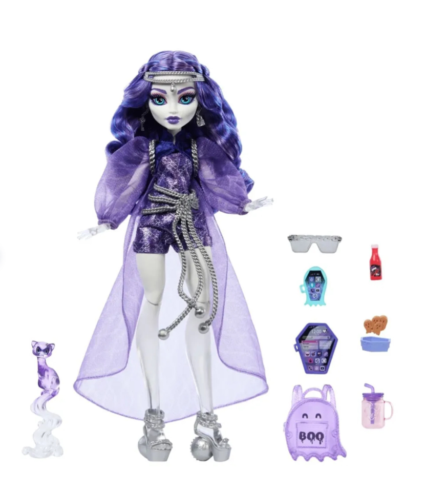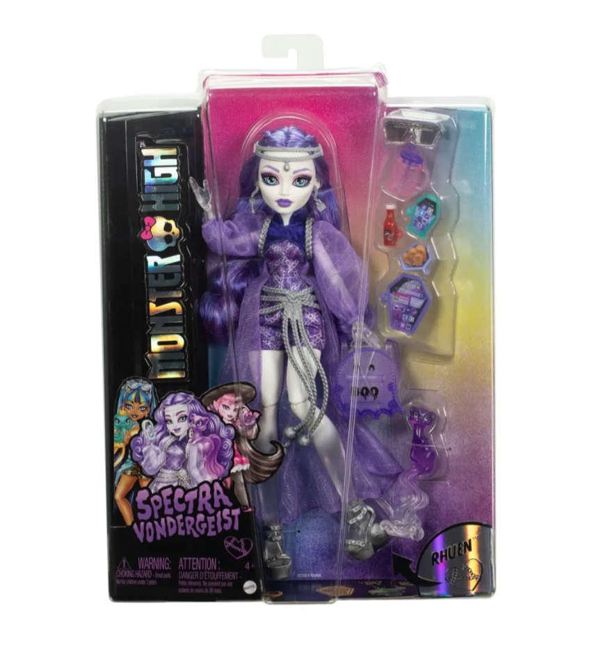 Monster High представляет Спектру Вондергейст, ужасное привидение, которое любит практиковать свои страхи на друзьях! Кукла Спектра Вондергейст щеголяет в наряде, идеальном для фантастического призрака, вроде нее самой. Кроме того, она идет со своим домашним хорьком Руэном и множеством пугающе-крутых аксессуаров! Дети от 4 лет и старше будут в восторге от добавления ее в свою коллекцию кукол Monster High! Полностью шарнирная. Кукла не может стоять одна. Цвета и украшения могут отличаться. Кукла Monster High Spectra Vondergeist — воплощение призрачной грации в ее фиолетовом обличье! Она поставляется со множеством тематических деталей, чтобы поощрять жуткие истории и веселье в создании стиля. Этот призрак готов скользить по коридорам в своем прозрачном пальто. Она носит комбинезон с цепным принтом, серебристый пояс с шариками и цепочкой и соответствующие туфли. В комплекте с ней идет множество пугающих аксессуаров, которые будут вдохновлять воображение: рюкзак, напиток на вынос, солнцезащитные очки, призрачные наггетсы с соусом из призрачного перца, а также телефон и планшет iCoffin! Спектра Вондергейст готова отправиться во все свои любимые места со своим любимцем Руэном — таинственным хорьком, который выглядит так, будто материализовался из тумана! Ознакомьтесь со всей коллекцией кукол и игровых наборов Monster High, чтобы вдохновиться на еще больше модных развлечений и страшных приключений! Каждая продается отдельно, в зависимости от наличия. В комплекте: • 1 кукла Spectra Vondergeist • 1 фигурка питомца • аксессуары.