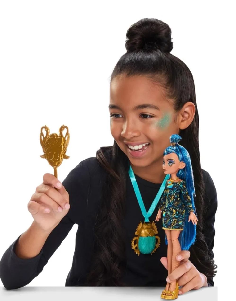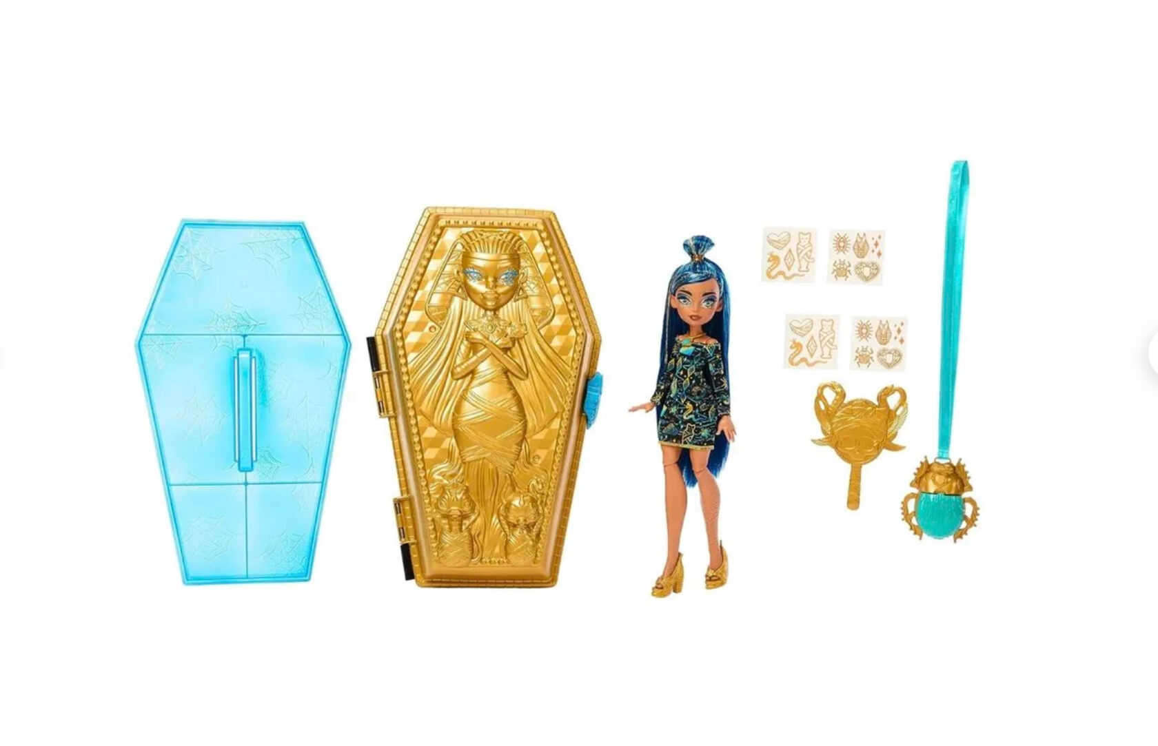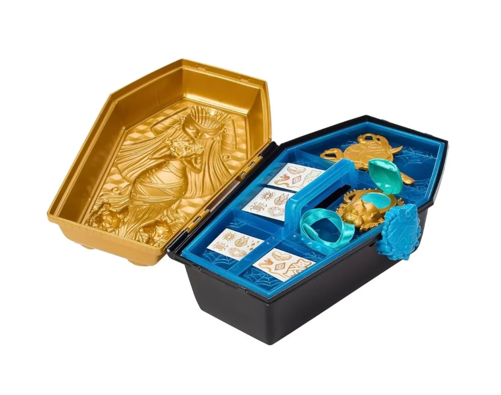 Кукла Клео Де Нил засыпает своим прекрасным сном в саркофаге, достойном королевы! У нее есть роскошная косметичка с драгоценными камнями, в которой можно хранить ее саму и ее сокровища: золотые татуировки, ожерелье в виде скарабея с маркером и красивое зеркальце. Дети от 4 лет и старше могут носить эти страшно крутые находки и делиться ими с другими, чтобы выглядеть в точности как Cleo De Nile! Полностью шарнирная кукла. Кукла не может стоять одна. Цвета и украшения могут варьироваться.