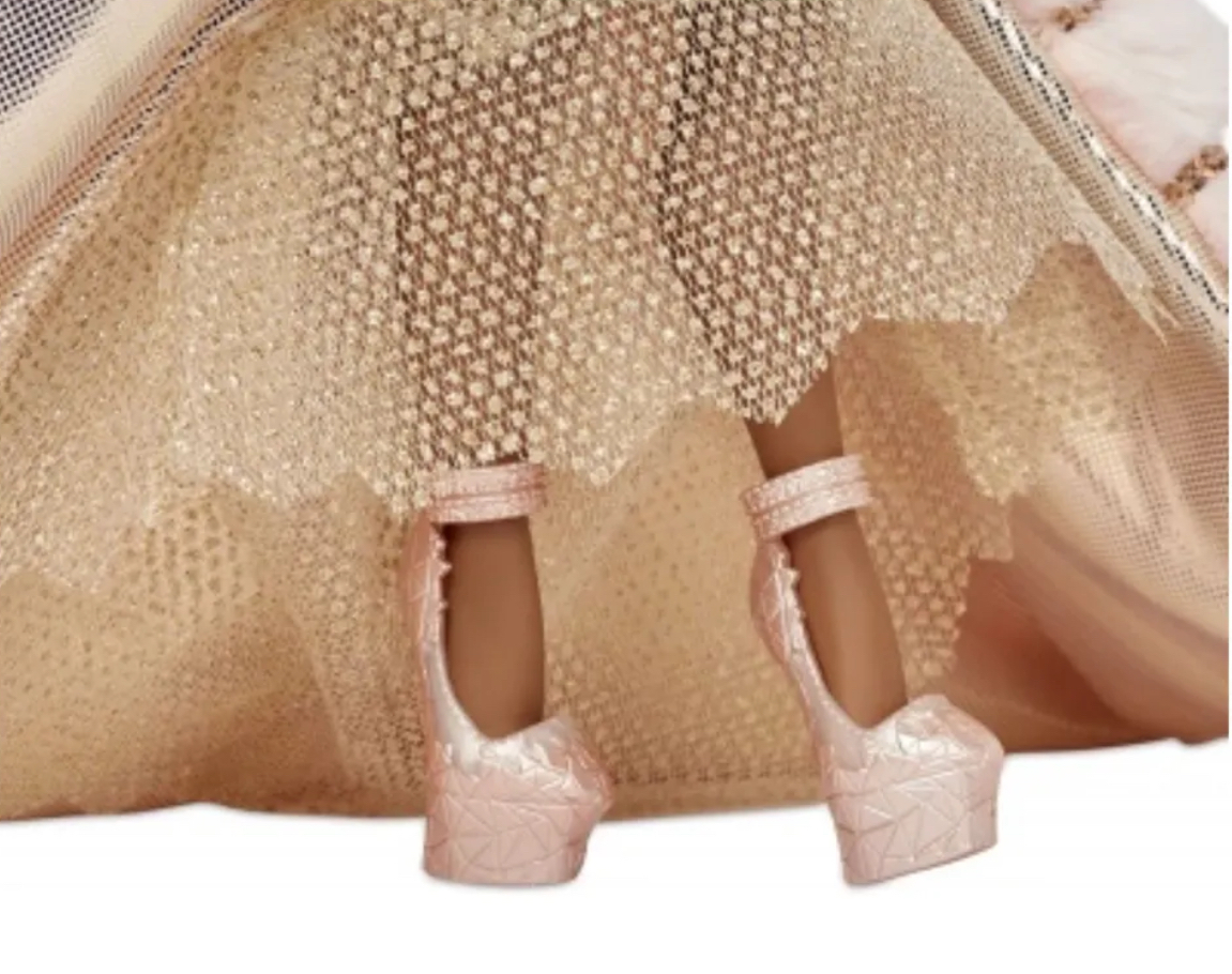 Кукла Cleo De Nile демонстрирует свой непревзойденный стиль в платье с принтом иероглифов в сочетании с потрясающим ожерельем и туфлями на каблуках с открытым носком.