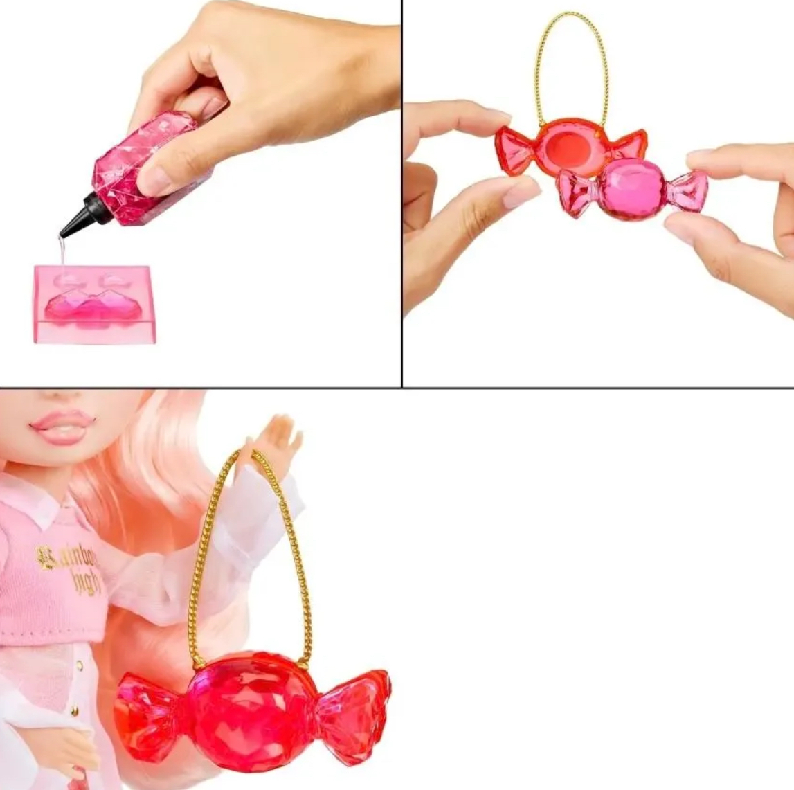 Набор Rainbow High Creative Crystals Bella — целый мир моды и творчества! Он включает куклу в роскошном наряде в розовых тонах и все необходимое для создания сверкающих аксессуаров. Для Беллы можно сделать эффектный воротник, солнцезащитные очки, серьги, сумочку и ободок с кристаллами, для себя — сверкающее кольцо. Кристаллы выполняются из специальной смолы, которая заливается в формы и помещается на солнце до застывания — в комплект включена подробная инструкция. Дети смогут самостоятельно сделать украшения и придумать модные образы, проявив фантазию и креативность.