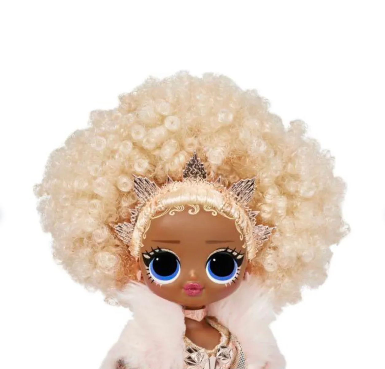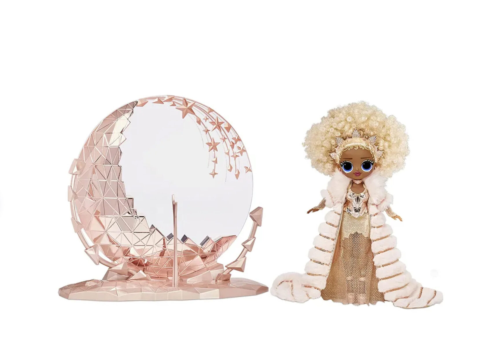 Удивительная куколка LOL OMG 2021 Holiday с синими большими глазами и кудрявыми светлыми волосами, собранными в высокий хвост – настоящая фэшн дива. У куколки красивые кудрявые светлые волосы, на лице красивый макияж. Куколка одета в облегающее длинное блестящее платье с золотым корсетом и пышную розовую шубу в пол. Настоящий новогодний образ. Модница похожа на королеву, которая живет в луне. За куколкой находится большой золотой месяц с диско-шаром, а модница стоит на светящейся подставке. В наборе: куколка, аксессуары, декорация в виде месяца с диско-шаром, светящаяся подставка. Особенности набора: у куклы шарнирные руки, соединяемые детали платья, снимаемые аксессуары, платье блестит благодаря подсветке на подставке. Внимание! Для работы игрушки необходимы 3 батарейки АА/LR6.