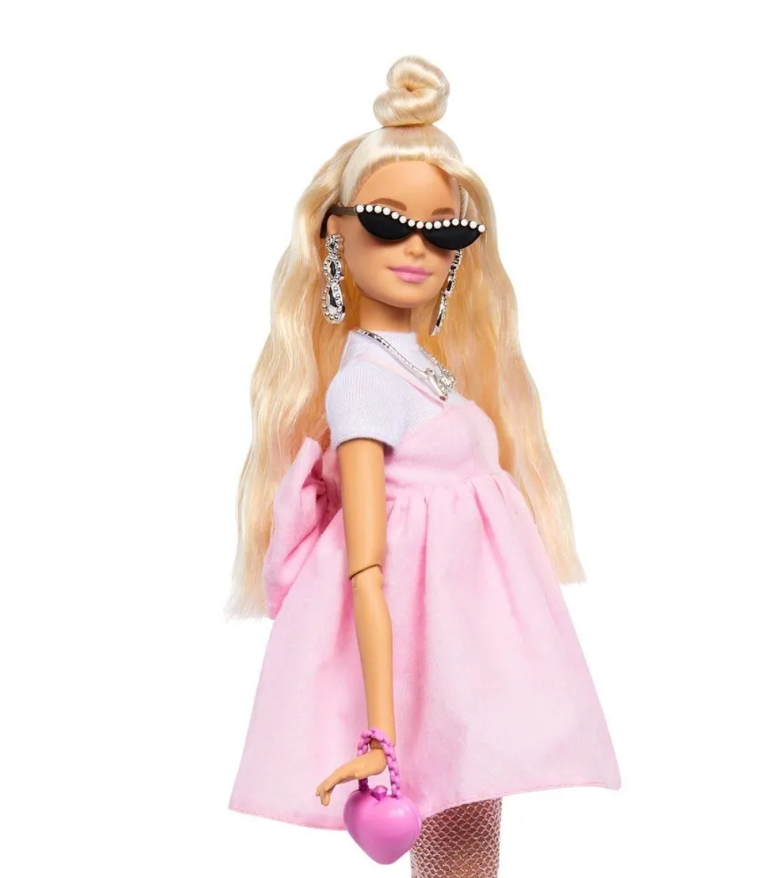 Кукла Барби сочетает свой наряд с солнцезащитными очками в форме сердечек, розовой сумочкой и эффектными серебристыми украшениями. Гибкие суставы позволяют ей принимать любые позы!