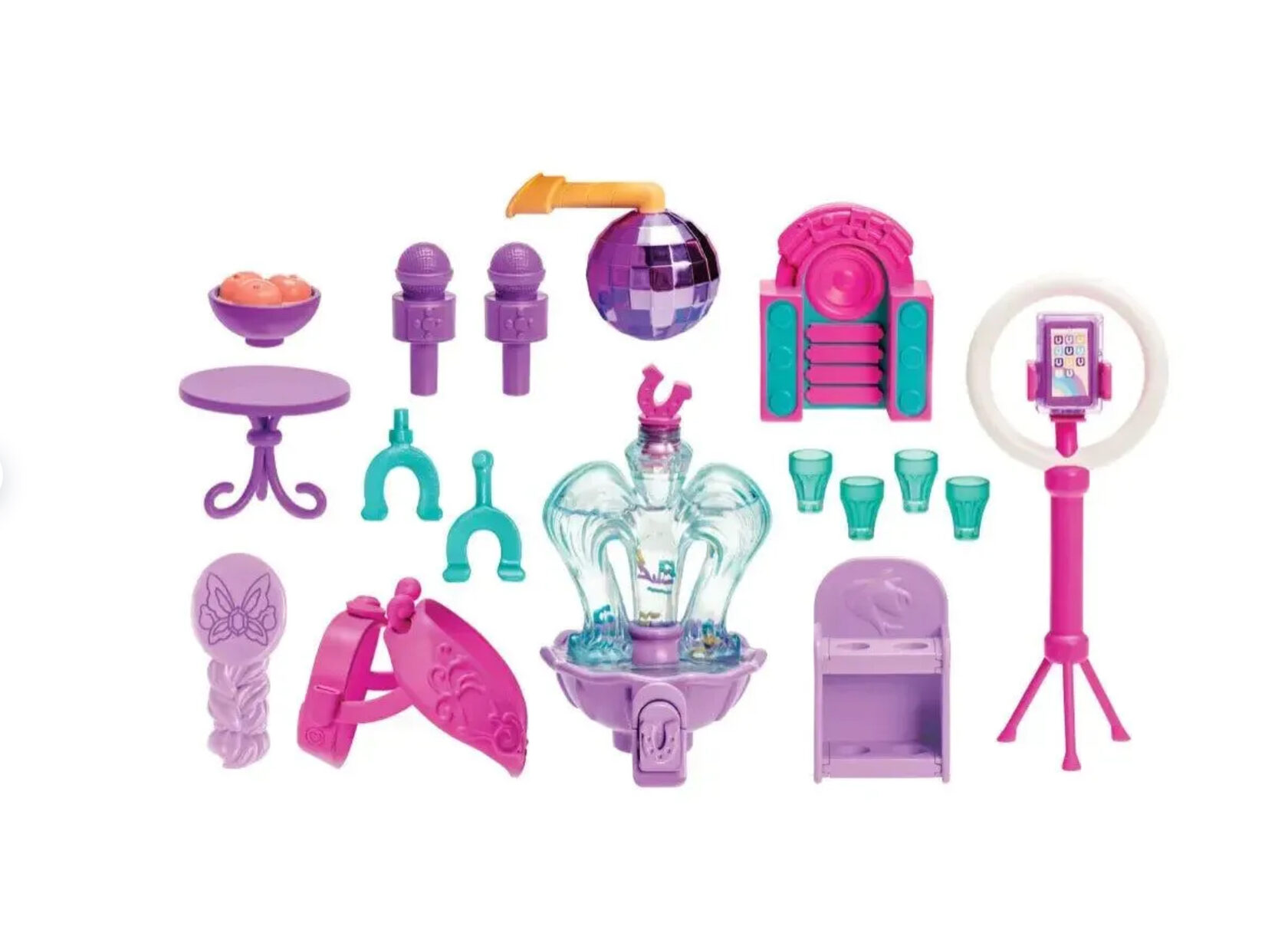 В этом игровом наборе представлена Перла, персонаж мультсериала и игровой игры Roblox Wild Manes ("Дикие гривы"). У каждой лошади Wild Manes есть индивидуальность, которая соотносится с ее прической и дизайном; переливающаяся голубая прядь Перлы, например, передает ее искрометную сущность. Этот набор - ее трейлер для вечеринки, в который входит более 20 игровых элементов - караоке-станция, светящаяся дорожка и фонтанчик с газировкой. А сама Перла с переливающимися локонами - идеальная хозяйка вечеринки!Перла - выдающаяся хозяйка, которая любит отмечать все маленькие, но важные моменты своей жизни. А ее сказочный клуб - идеальное место для проведения любого торжества. С более чем 25 интерактивными элементами, включая игровую фотобудку, вращающийся диско-шар и светящийся подиум, здесь есть во что поиграть!Волосы лошадки, как и сама фигурка, просто великолепны. А еще здесь много возможностей для творческих игр, и даже есть элементы ретро, которые оценят родители (например, музыкальный автомат для караоке). И современные приспособления тоже имеются, например, подставка для селфи.Дети также могут настроить набор с помощью прилагаемых наклеек. Он красиво упакован и является идеальным украшением для коллекции лошадей.Также в набор встроены селфи-станция и миниатюрное световое кольцо, но они легко снимаются и предназначены исключительно для ролевых игр.